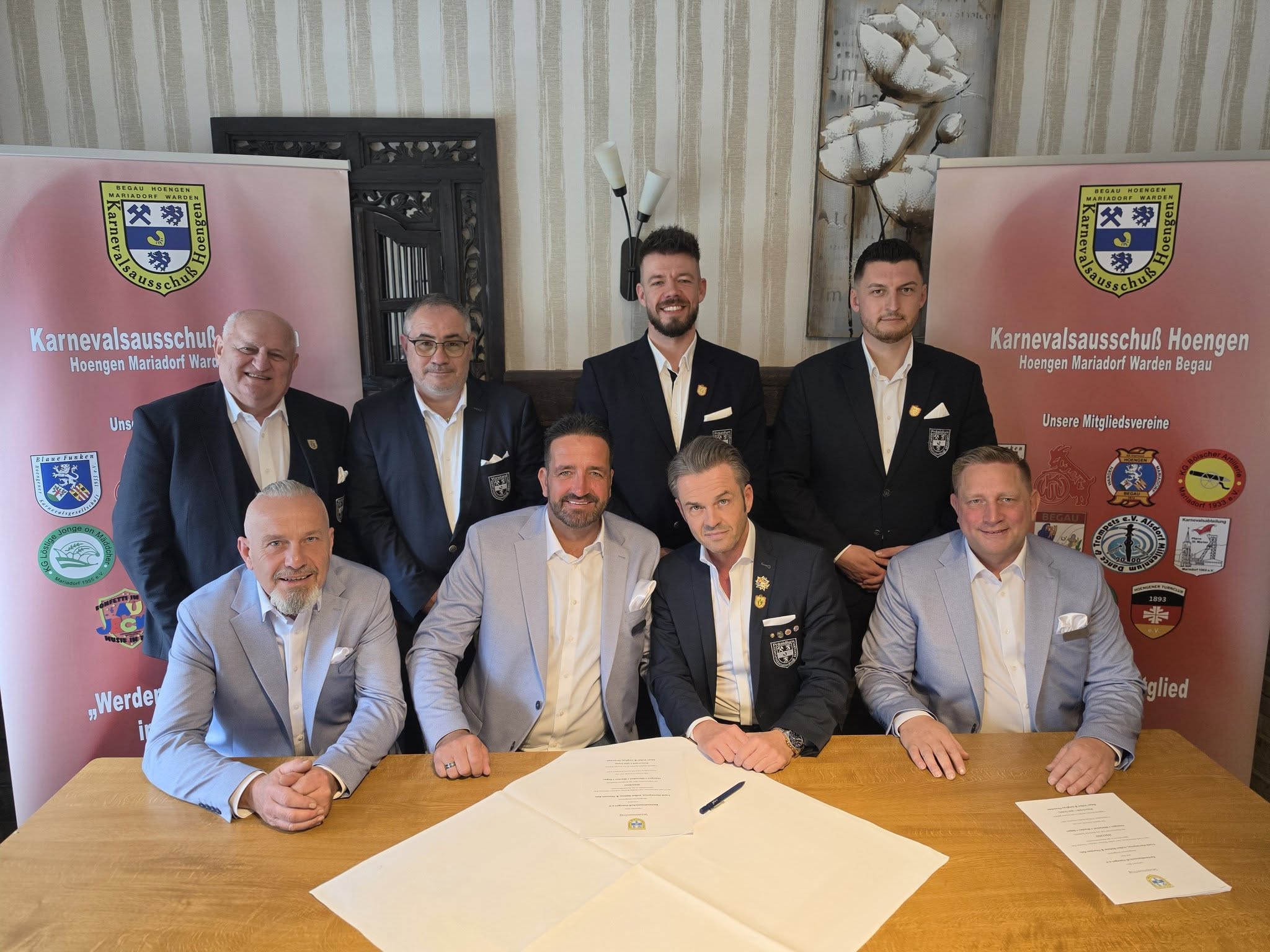 Im Anschluss an die Vertragsunterzeichnung wurden Fotos von den Tollitäten, dem Gefolge und den Vertretern des Karnevalsausschuss Hoengen e.V. erstellt. Offiziell proklamiert, wird das designierte Dreigestirn am 14.11.2026.